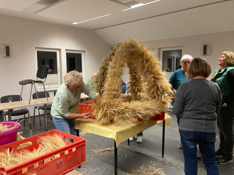 Zuvor traf man sich auf dem Dorfplatz und stellte die mit viel Fleiß und Geschick gefertigte Erntekrone auf.