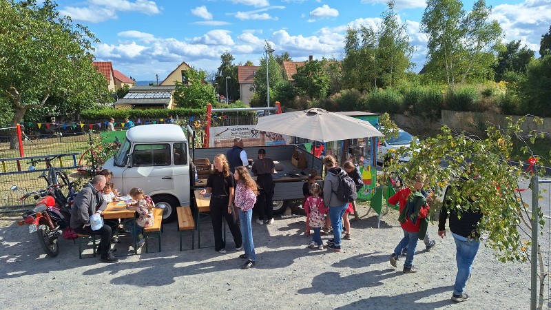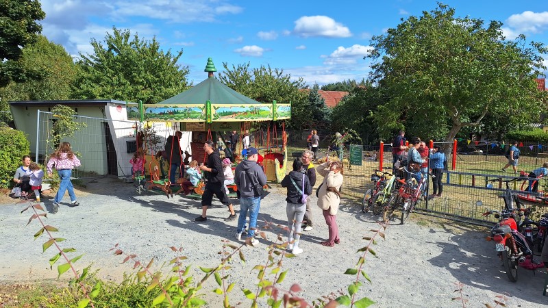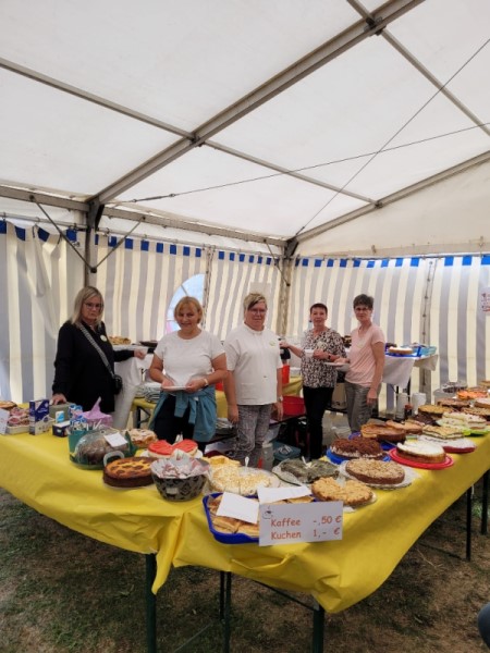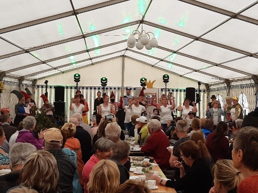 Der Sonnabend begann mit einem Morgengruß – unserer Yogastunde im Festzelt. Nachmittags gab es das legendäre Kuchenbuffet, liebevoll von so Vielen aus dem Dorf gebacken – ein echtes Stück Heimat auf dem Teller. Für unsere große Zahl an Kindern lockte ein toller Spieleparcours, Kinderschminken und ein Kinderkarussell. Ein Blick ins Dachdeckerhandwerk gelang bei Tom Heinemann, denn dort konnten Kinder und Erwachsene Schieferherzen schneiden und anschließend gestalten. Unsere Apfel-Tombola sorgte für reichlich Vitamine unter den Besuchern. Deshalb konnten auch Schneewittchen und die sieben Zwerge nicht „NEIN“ sagen. Mit unserem DEEJAY MR.RGR ging es stimmungsvoll bis weit nach Mitternacht.